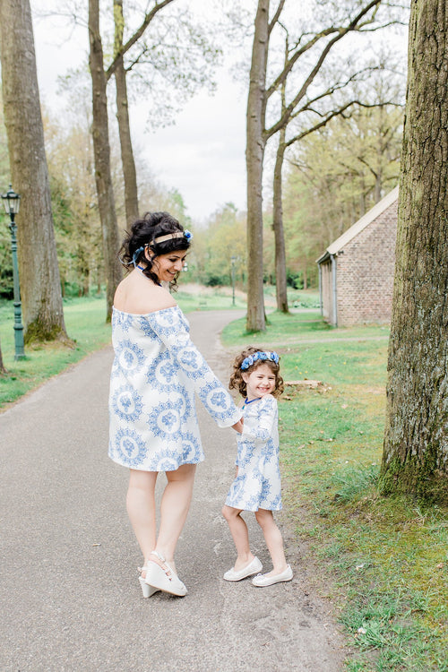 Wees boho chic a deux met je mini-me in deze perfecte vakantie look-met een op prachtige Marokkaanse tegel geïnspireerde print. Je zult samen veel complimenten krijgen in deze trendy off-shoulder stijl!
