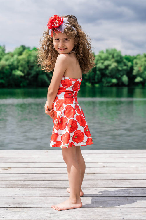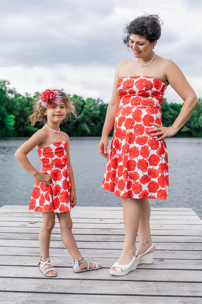 We zijn gek op deze rode poppy jurk! Regen of zon; jullie zullen altijd schijnen in deze cocktailjurk met uitbundige klaprozenprint! Het heeft een prachtige strapless top en een iets uitlopende rok. Draag ze naar elk zomerfeestje en rock met je mini me!